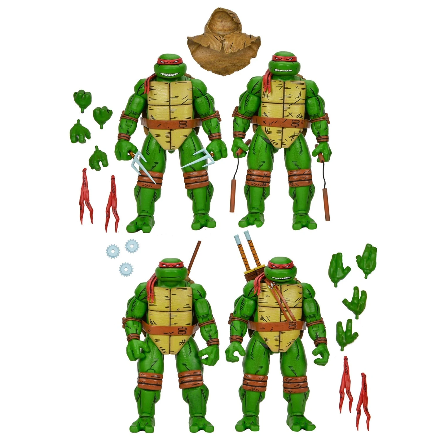 - Four 7″ scale action figures of the Turtles