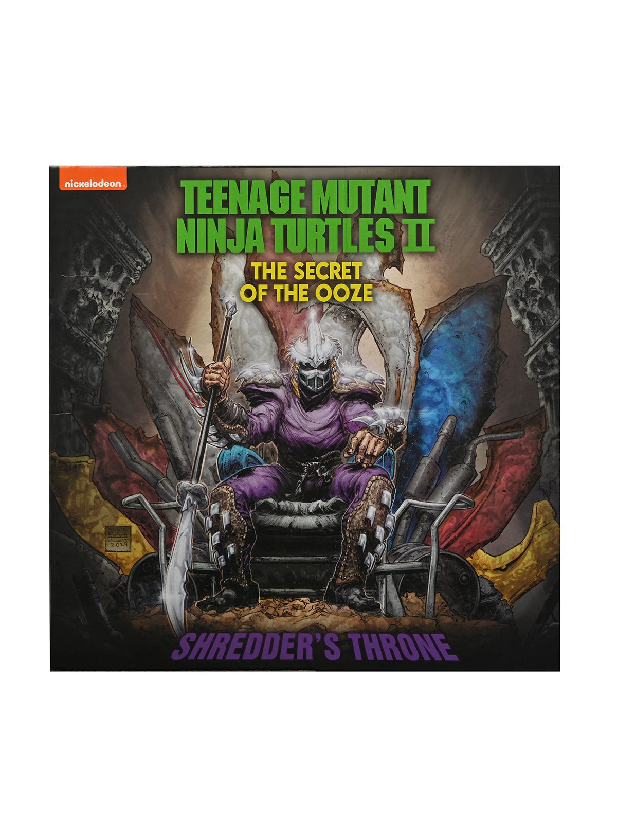 Those heroes in a half-shell are back in an all-new movie adventure! Find the “Secret of the Ooze” as the fearsome foursome go after the glowing canister that has slipped into the hands of the evil Shredder and his mutant allies. NECA is proud to present the centerpiece to any TMNT fan’s collection: Shredder’s Throne! This epic scrap metal throne didn’t appear in the final cut of the 1991 film but was featured on a single collector’s card.