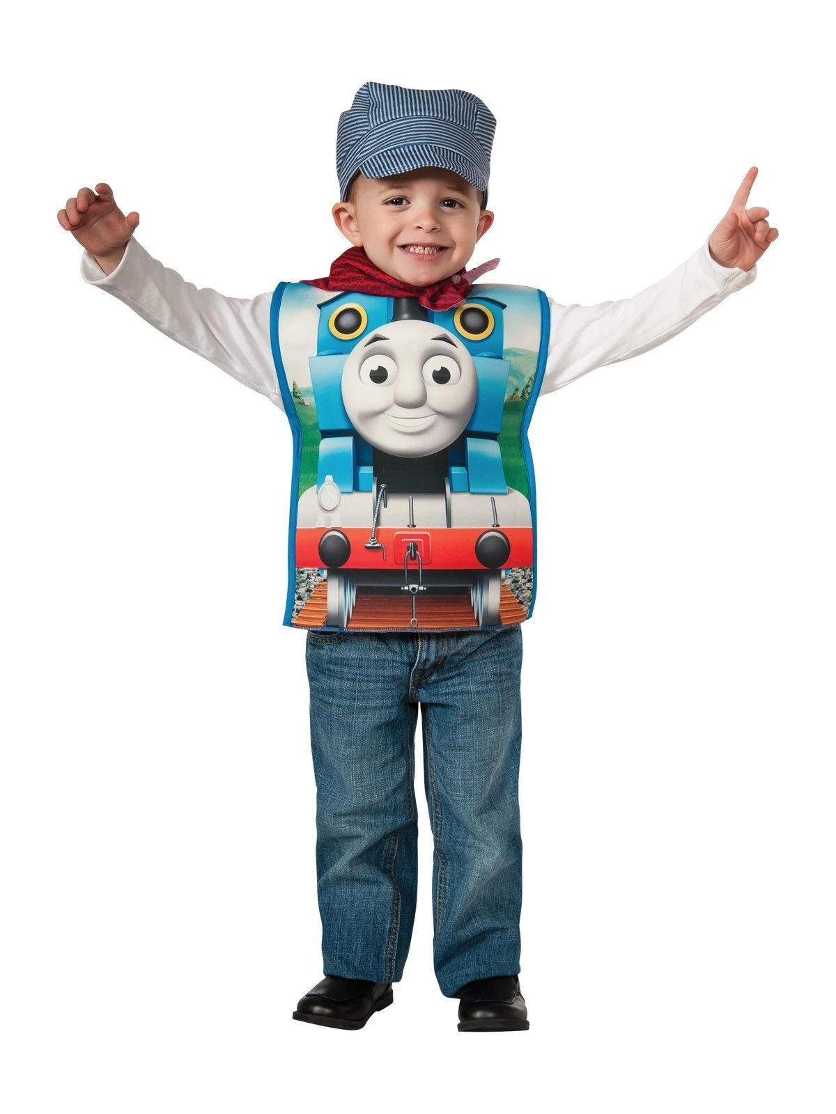 Thomas the Tank Engine is a British steam locomotive in The Railway Series books by the Reverend Wilbert Awdry first published in 1945 in the UK. The talking Tank is a blue steam engine with the number 1 painted on his side. He shares lots of adventures in his home town of Sodor with trusty friends James, Percy, Henry, Toby, the Fat Controller, Annie and Clarabel to name a few. This famous and friendly Steam Train has made children smile for generations, as they read the books, watch the TV series on ABC kids, sing the song and play with their train sets. Time to Choo Choo along and dress your little Conductor in this adorable Thomas The Tank Costume. Perfect for parties, Book Fun day at Kinder or just playing!