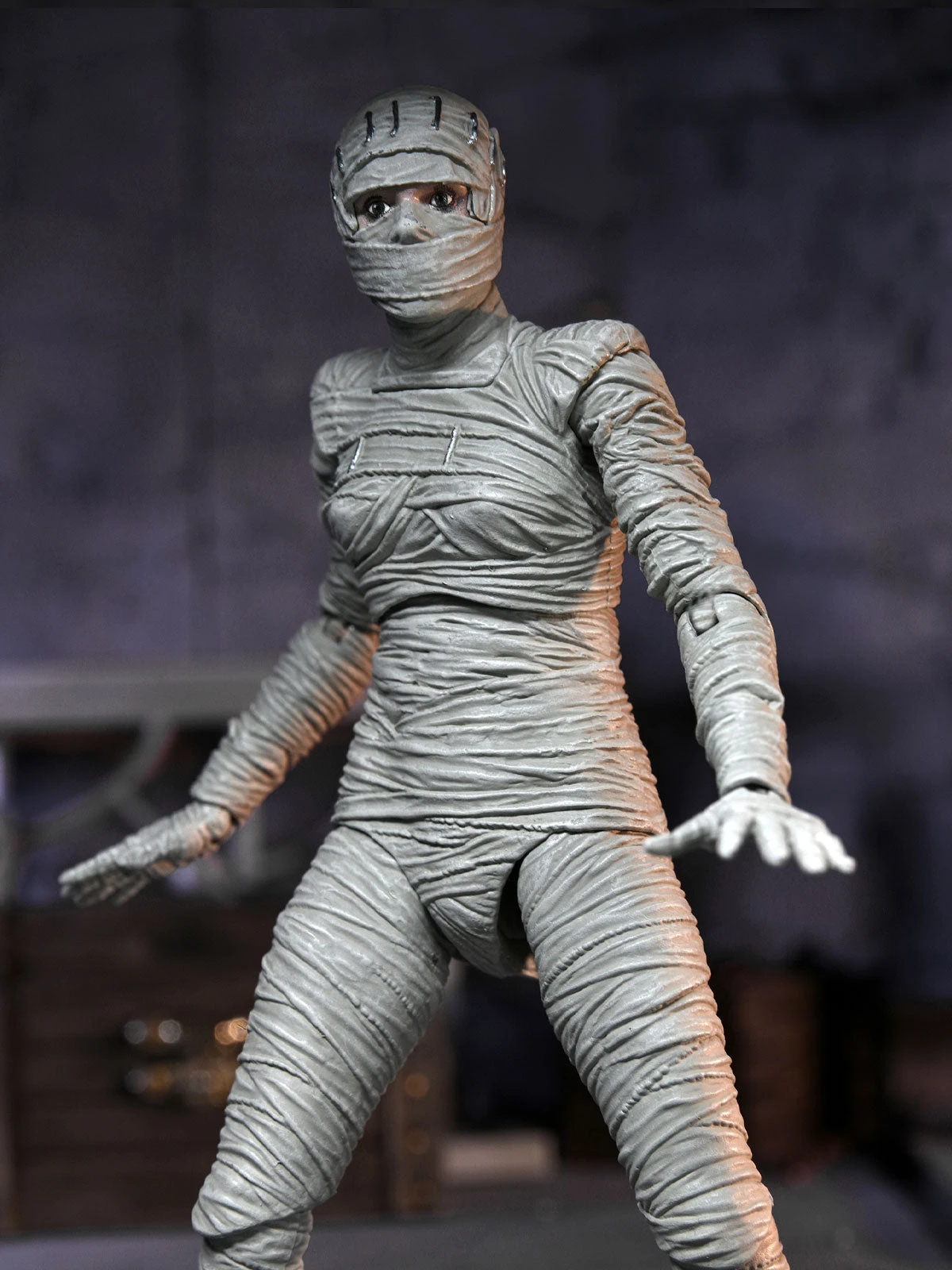 - Bandages, removable gown, two pairs of hands, and three interchangeable head sculpts
