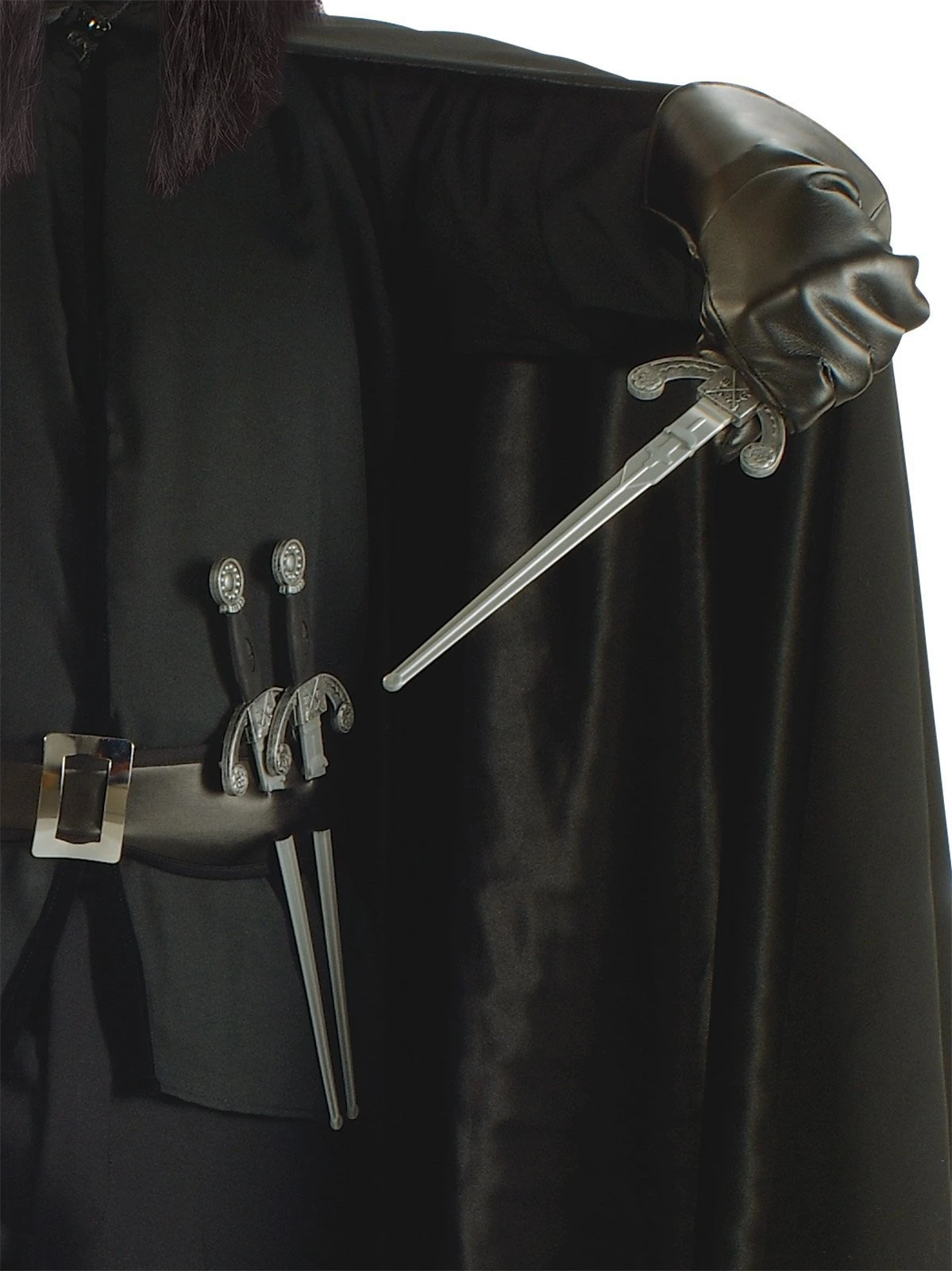 - Faux leather belt with silver metal buckle and places to hold daggers, plus 6 moulded and painted plastic daggers