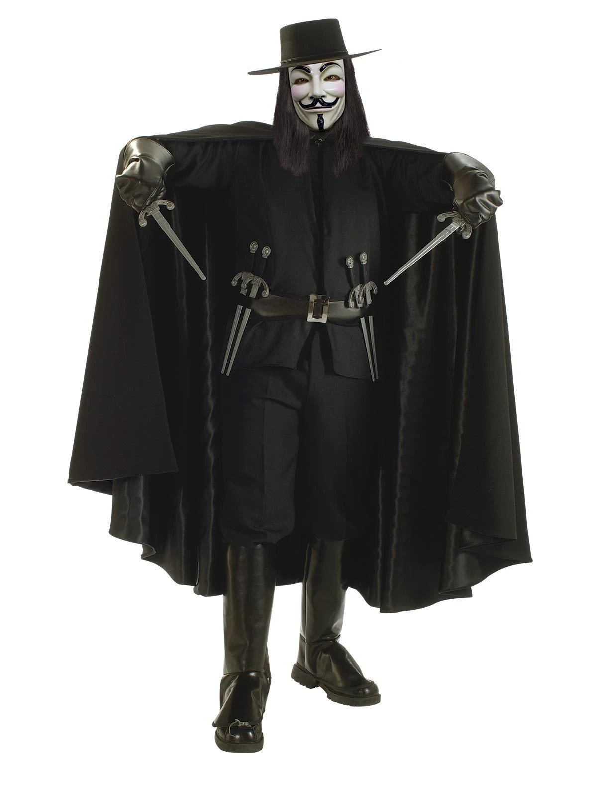 - Long satin lined cape with button fasten at neck, black top hat, and plastic Guy Fawkes mask with padding on inside and elastic strap